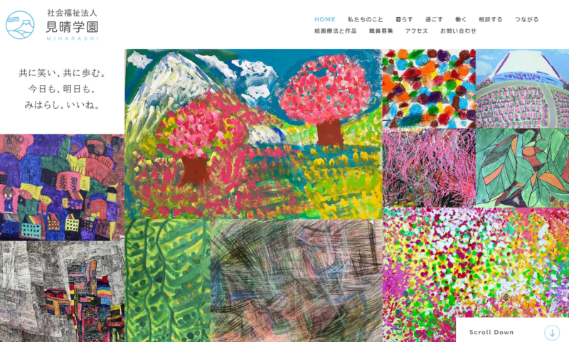 施設利用者のアート作品や笑顔あふれる写真を使用し、温かく親しみやすいデザインでサ...